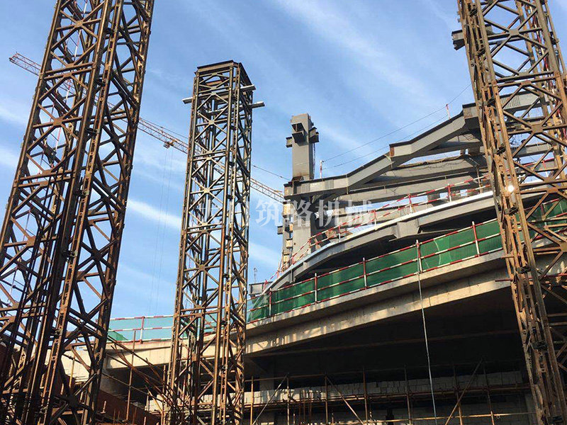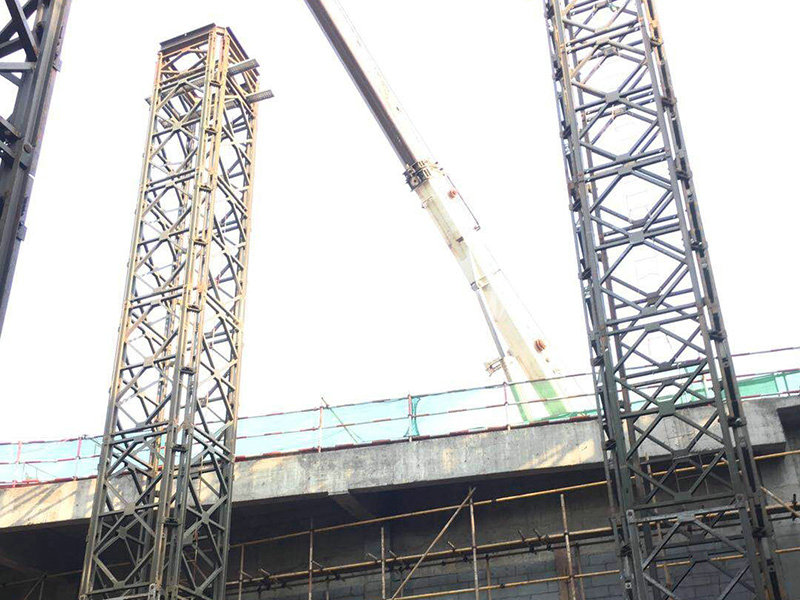 基本情況:部分構(gòu)件工廠組裝好,分片運(yùn)輸至現(xiàn)場。采用4片321型貝雷片組合而成的貝雷方柱作為大跨度鋼桁架下部的臨時(shí)支撐胎架,待上部鋼桁架安裝完成后分級卸載,最后分片拆除。拆卸后鋼桁架撓度符合要求。貝雷方柱支撐胎架高度達(dá)20m,支撐荷載約50t。